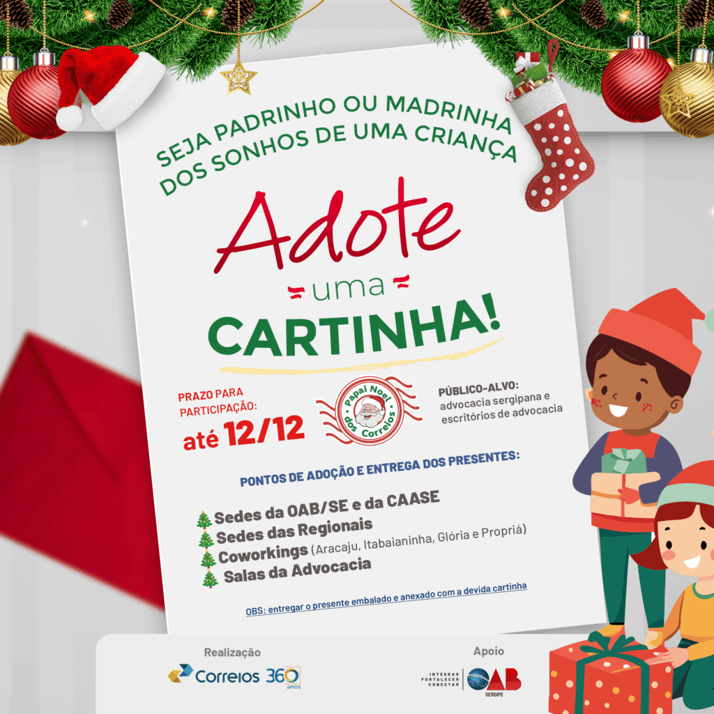 Dezembro chegou trazendo a magia do Natal e renovando o sentimento de esperança, solidariedade e amor ao próximo. É com esse espírito que a Ordem dos Advogados do Brasil – Seccional Sergipe (OAB/SE) participa, pelo terceiro ano consecutivo, da Campanha Papai Noel dos Correios um momento especial para somar esforços e transformar sonhos em realidade.
