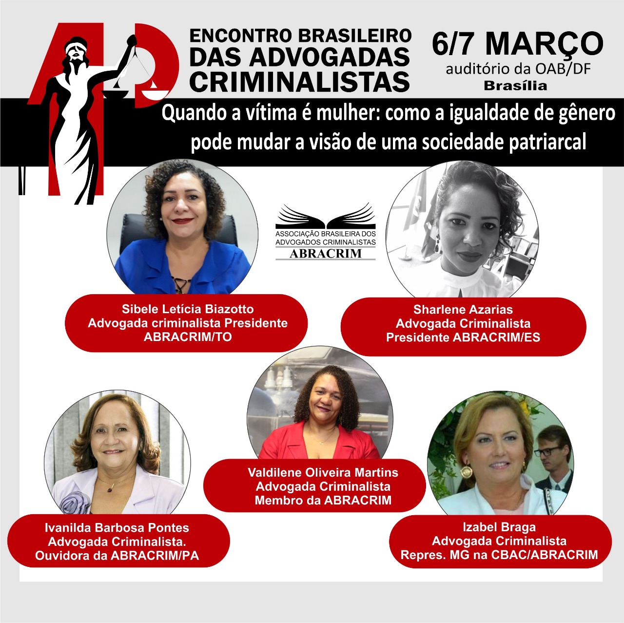 No dia 7 de março, em Brasília, a vice-presidente da Comissão, Valdilene Martins, em uma roda de conversa no I Encontro Brasileiro das Advogadas Criminalistas, colocará em debate a igualdade de gênero como um dos instrumentos capazes de transformar a sociedade patriarcal.