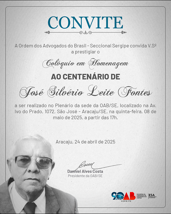 A Ordem dos Advogados do Brasil – Seccional Sergipe (OAB/SE), em comemoração aos 90 anos da instituição, realizará na próxima quinta-feira, dia 8, o Colóquio em homenagem ao Centenário de Silvério Fontes. Na ocasião, será aberta a Exposição Itinerante que conta a história de vida do intelectual e membro honorário vitalício da OAB/SE.