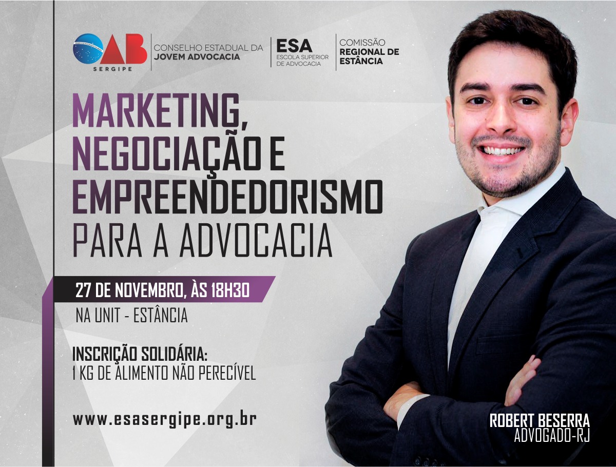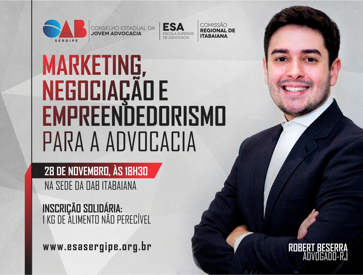 Nos dias 27, 28 e 29 deste mês, a Ordem dos Advogados do Brasil, em Sergipe, através do Conselho Estadual da Jovem Advocacia, promove, na capital e no interior do Estado, a palestra “Marketing, Negociação e Empreendedorismo”, que terá como foco a carreira advocatícia.
