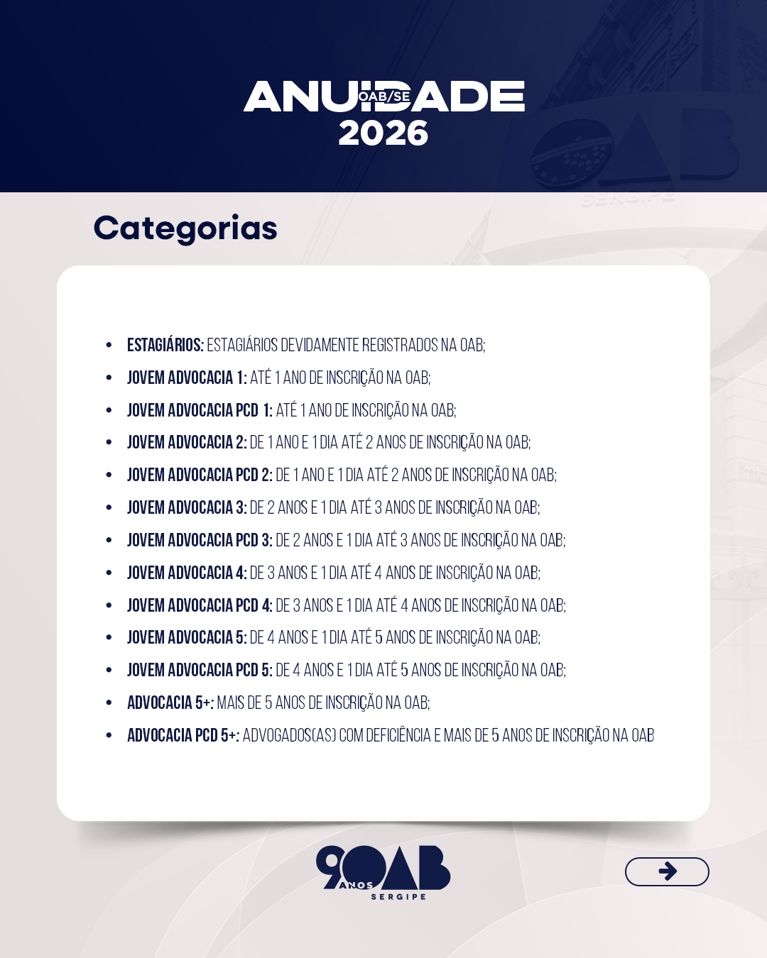 “A anuidade é essencial para a manutenção e o fortalecimento das atividades institucionais da OAB, assegurando a continuidade dos serviços prestados à advocacia. É por meio desses recursos que a OAB/SE garante o funcionamento de suas estruturas, amplia o suporte à classe, fortalece a representatividade institucional e investe em ações voltadas à valorização e ao pleno exercício da advocacia”, finaliza o diretor-tesoureiro.