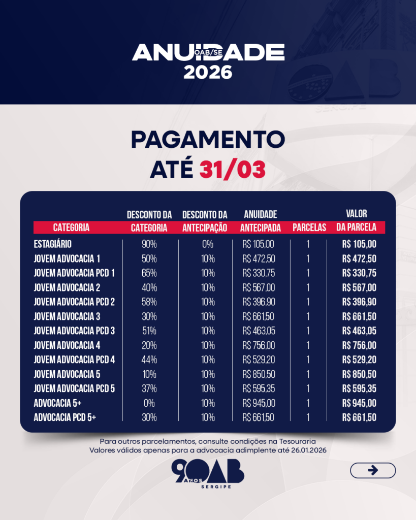 “A diretoria da OAB/SE ponderou que a prorrogação do prazo de adimplência até o dia 26 de janeiro seria razoável, permitindo que advogados e advogadas tenham mais tempo para se organizar e ficar em dia com a instituição. Assim, de forma excepcional, será garantido o acesso integral aos descontos da anuidade 2026 àqueles que regularizarem sua situação financeira até o dia 26 de janeiro”, explica o diretor-tesoureiro, Ismar Francisco.