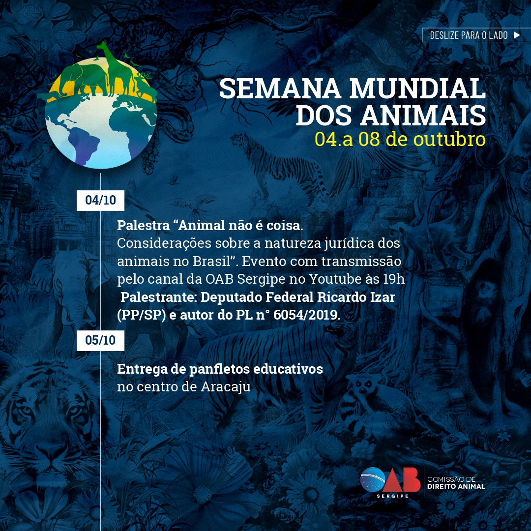 Na data alusiva ao dia mundial dos animais, em 4 de outubro, às 19h pelo YOUTUBE da OAB Sergipe ocorrerá a palestra do deputado Federal, Ricardo Izar, visando discutir a natureza jurídica dos animais no Brasil. O tema é de grande importância tendo em vista o andamento dos projetos de lei que dispõem sobre as alterações no Código Civil Brasileiro que ainda trata os animais como coisas.