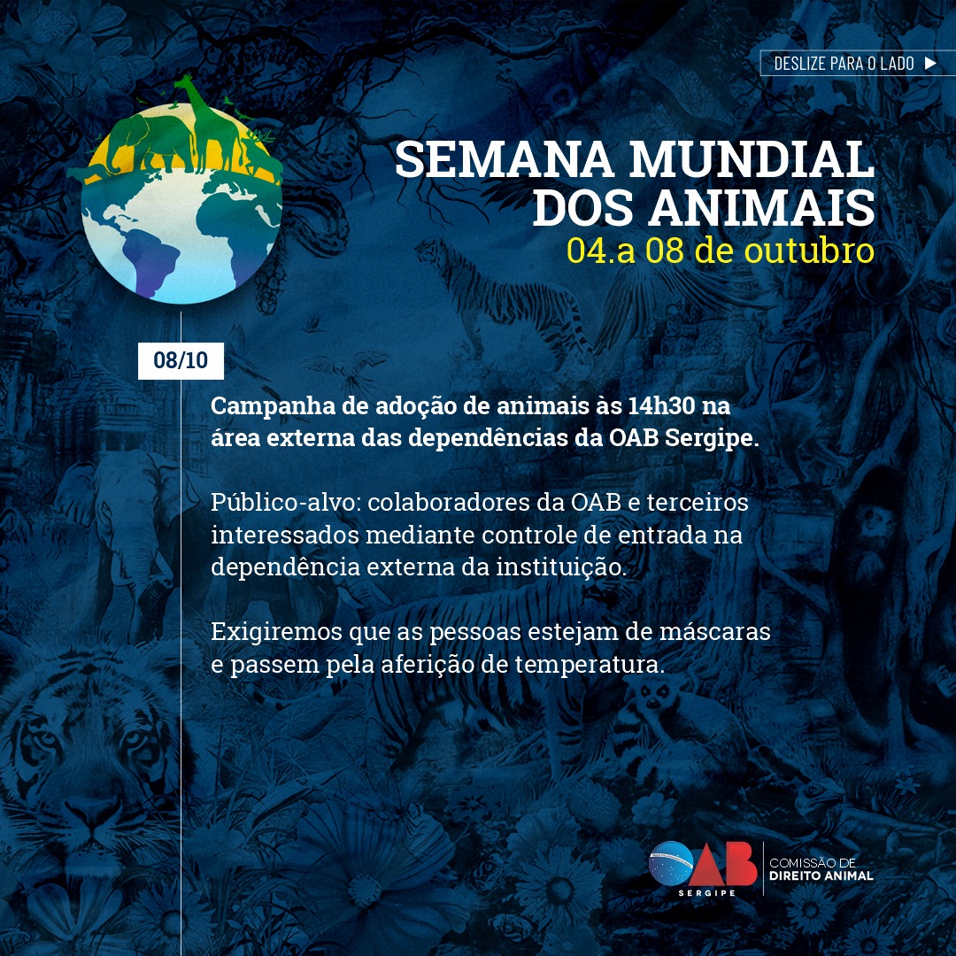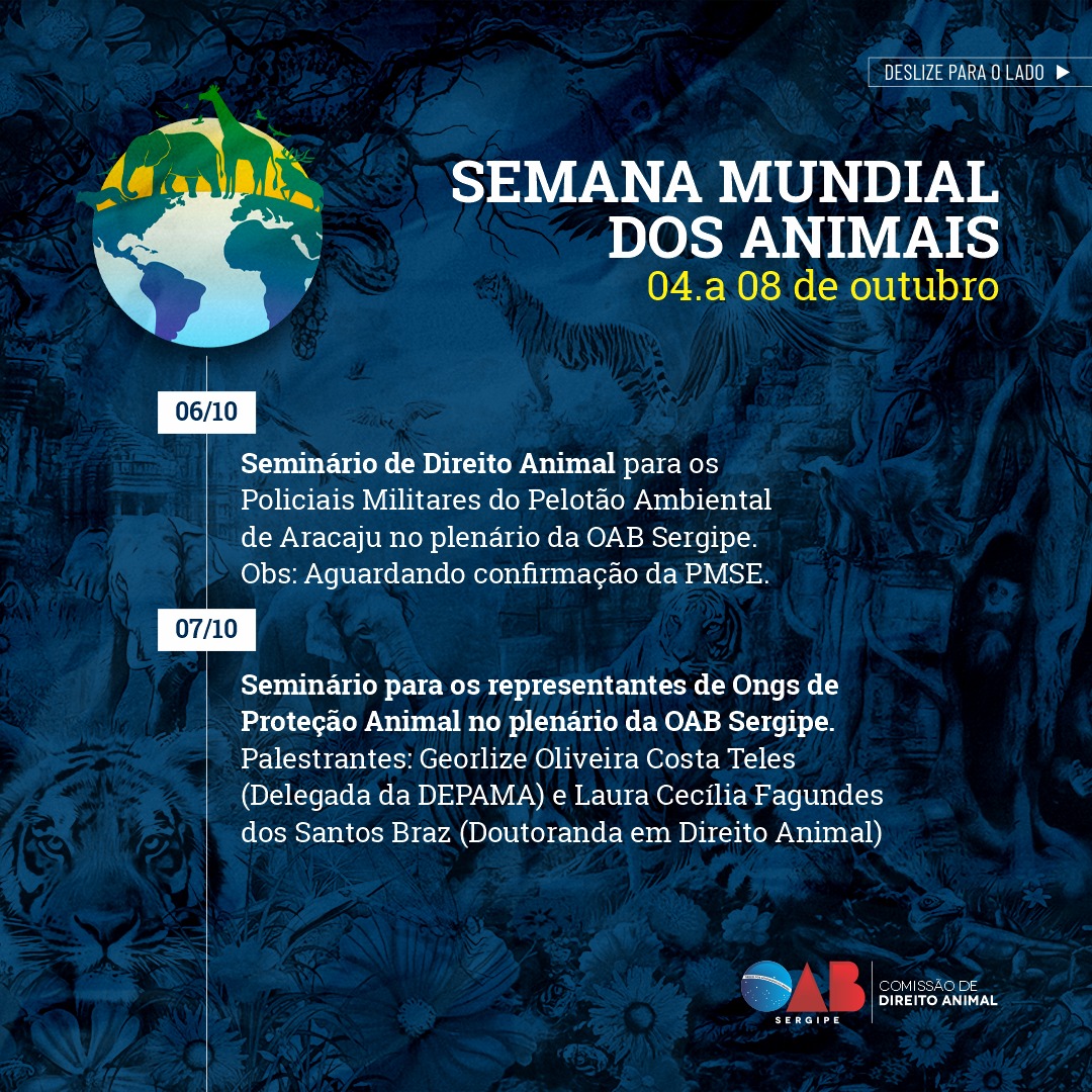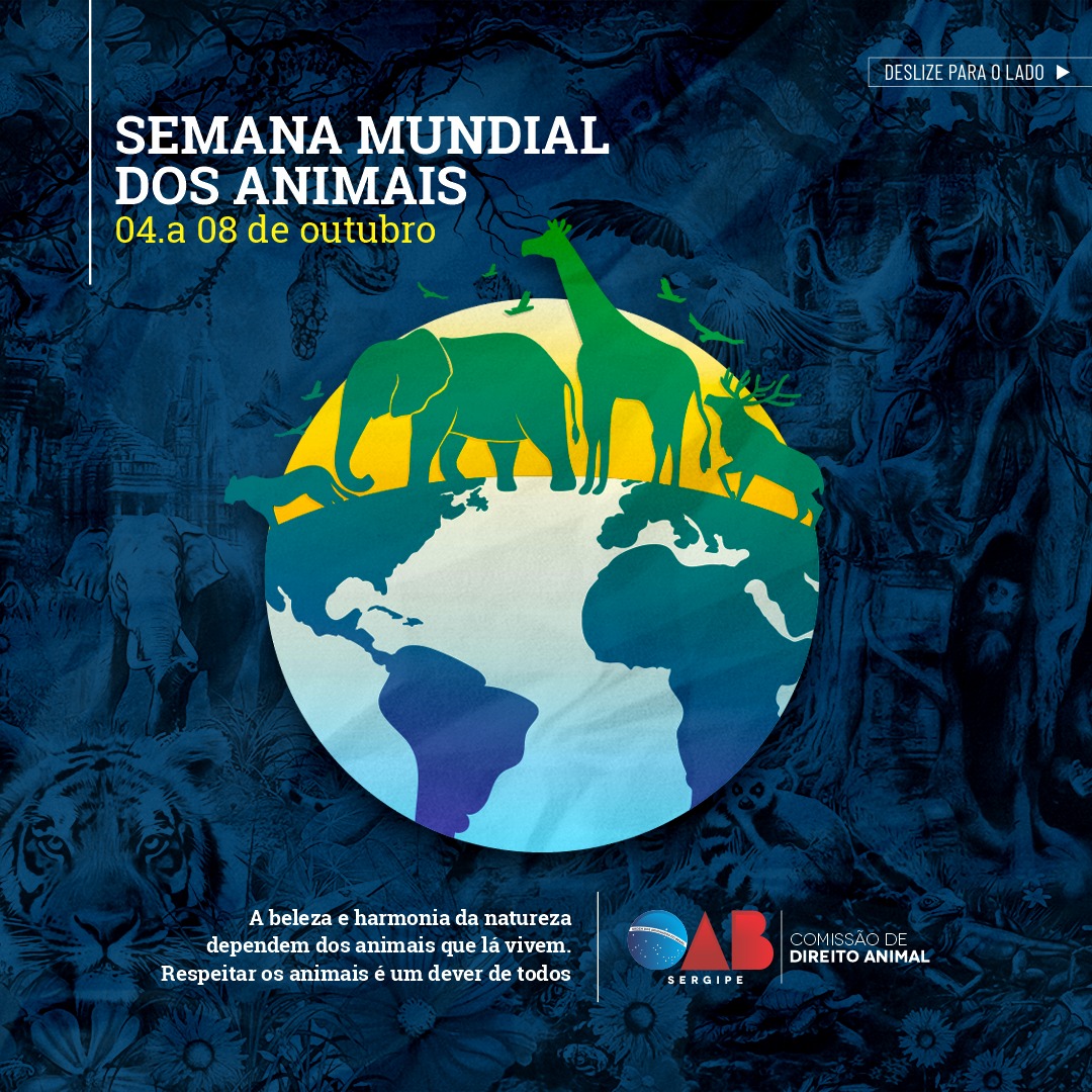 A Ordem dos Advogados do Brasil – Seccional Sergipe, por meio da Comissão de Direito Animal, realizará na Semana Mundial dos Animais de 4 a 8 de outubro, diversas iniciativas como forma de reafirmar o compromisso da Seccional em defender os direitos dos animais e promover a conscientização da sociedade sobre o tema.