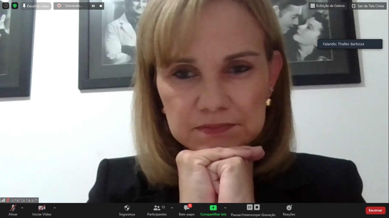 Em sua fala, América Nejaim afirmou que o sistema multiportas proporciona a democratização do acesso à justiça, possibilitando que os litígios venham a ser tratados e solucionados através da arbitragem e por meios autocompositivos que elevam o consenso e o altruísmo das partes.