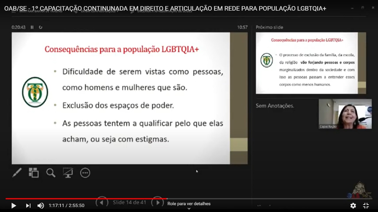 Nesta quinta-feira, 22, o primeiro dia da capacitação continuada em Direito e articulação em rede para população LGBTQIA+, realizada pela Ordem dos Advogados do Brasil, em Sergipe, abordou a trajetória, a justiça restaurativa e as sombras e traumas da população LGBTQIA+.