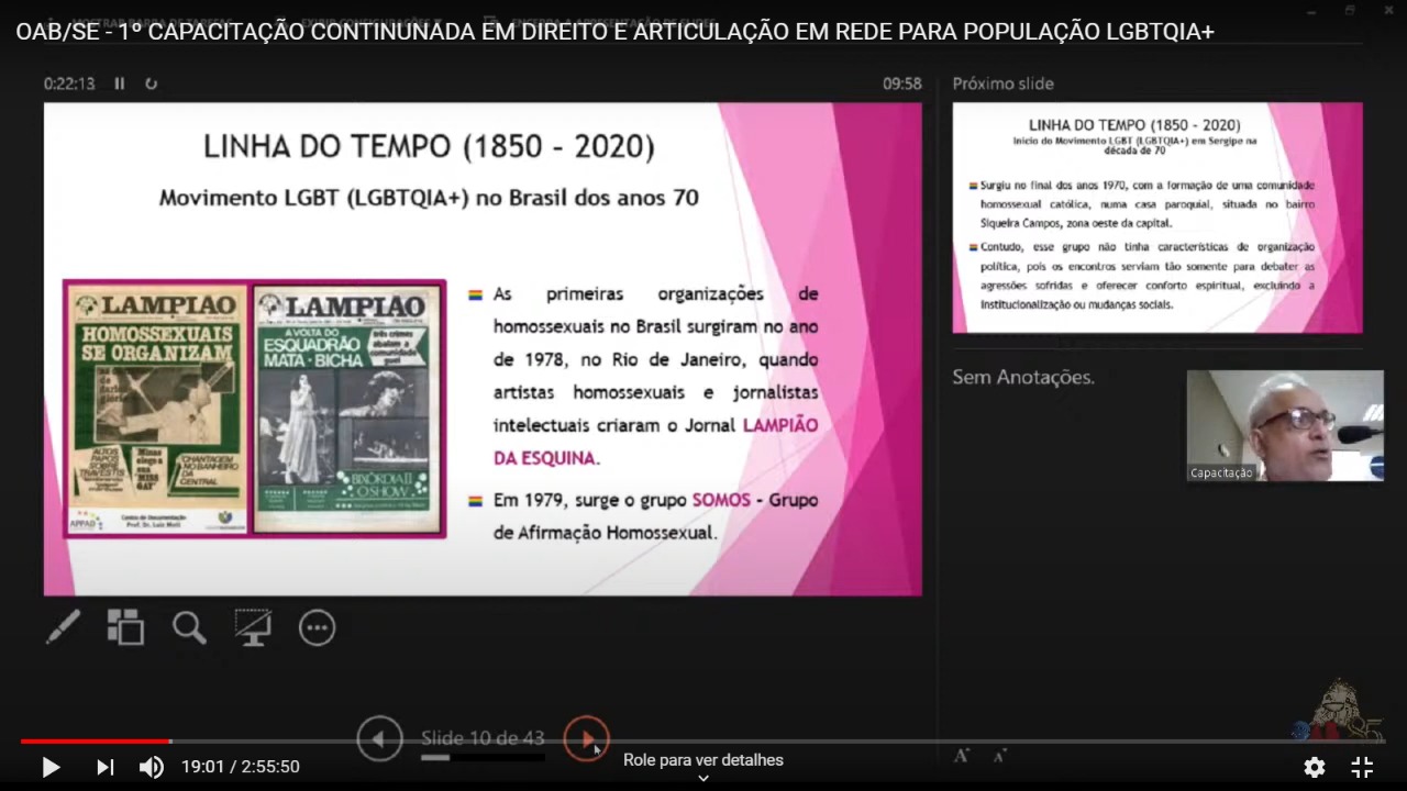 De acordo com o ministrante, as primeiras organizações de homossexuais no Brasil surgiram em 1978, no Rio de Janeiro, quando artistas e jornalistas criaram o jornal Lampião da Esquina. “E em 2979, surgiu o grupo SOMOS – Grupo de Afirmação Homossexual”, explicou Marcelo.