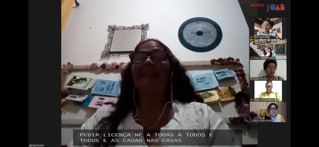 A poeta, agente de saúde e sanitarista, militante do movimento feminista negro sergipano, Gigi Poetisa, agradeceu ao convite a OAB/SE e disse que estava se sentindo uma negra, mulher, pobre, mãe, periférica, privilegiada por estar participando do evento. “Quero pedir licença a todas, todos e todes e dizer que estou muito emocionada em compartilhar esse espaço pelo convite feito pelo Grupo de Trabalho “Raça, Gênero e Etnia” e agradecer a Dra. Adélia Moreira Pessoa, Dra. Ana Lúcia, ao presidente da OAB/SE, Inácio Krauss, e aos demais que estão aqui e nos ouvindo em casa”, disse.